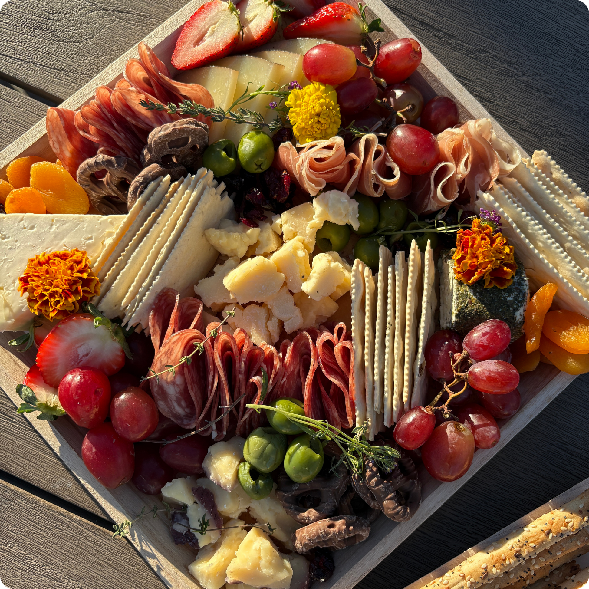 Perfect for intimate gatherings, our small charcuterie board includes a selection of cheeses and charcuterie complemented by fresh fruit, jam or honey, and assorted accoutrements. This 11” x 11” board serves